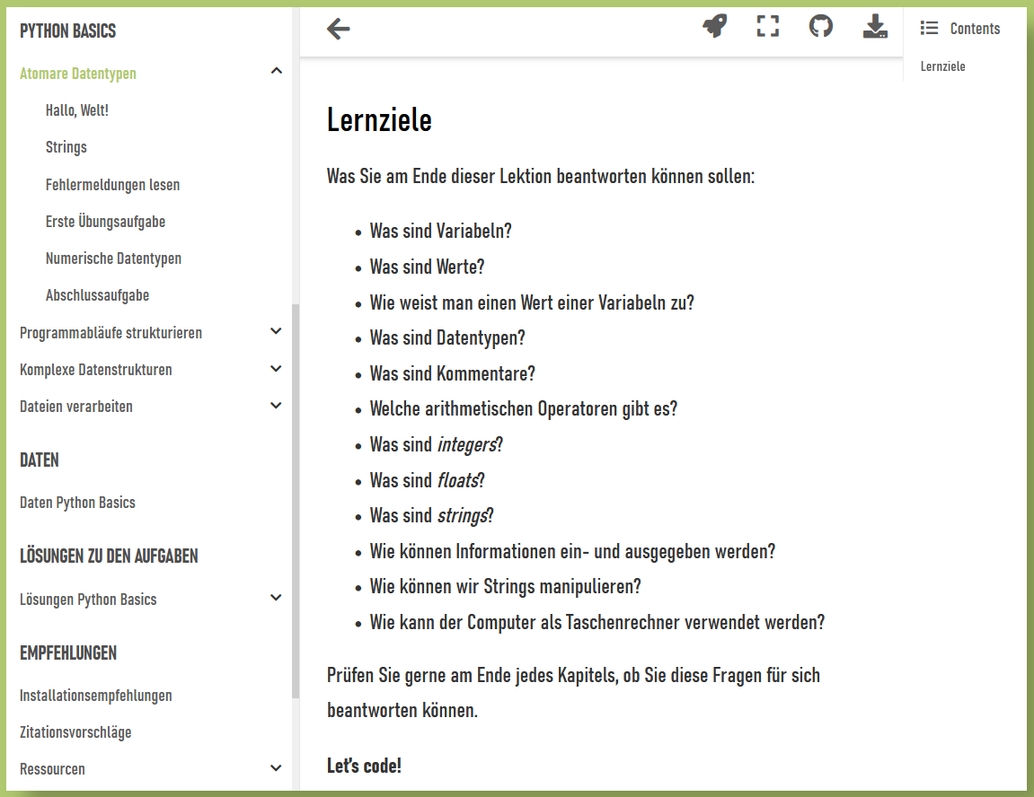 Die einzelnen Kapitel folgen in der Regel einem einheitlichen Aufbau: Zu Beginn werden die Lernziele festgelegt, so dass Sie am Ende für sich noch einmal prüfen können, ob Sie die aufgeworfenen Fragen für sich beantworten können. Den umfangreichsten Teil der Notebooks nimmt die Vermittlung der einzelnen Lehrinhalte anhand der Notebooks ein. Neben erläuternden Passagen finden Sie in den Unterkapiteln immer auch Codebeispiele zur Illustration. Unter “Contents” in der rechten Menüleiste erhalten Sie einen schnellen Überblick über die jeweiligen Abschnitte. Jedes Kapitel enthält zudem größere und kleinere Programmierprobleme, die Sie selbstständig lösen können und sollen.