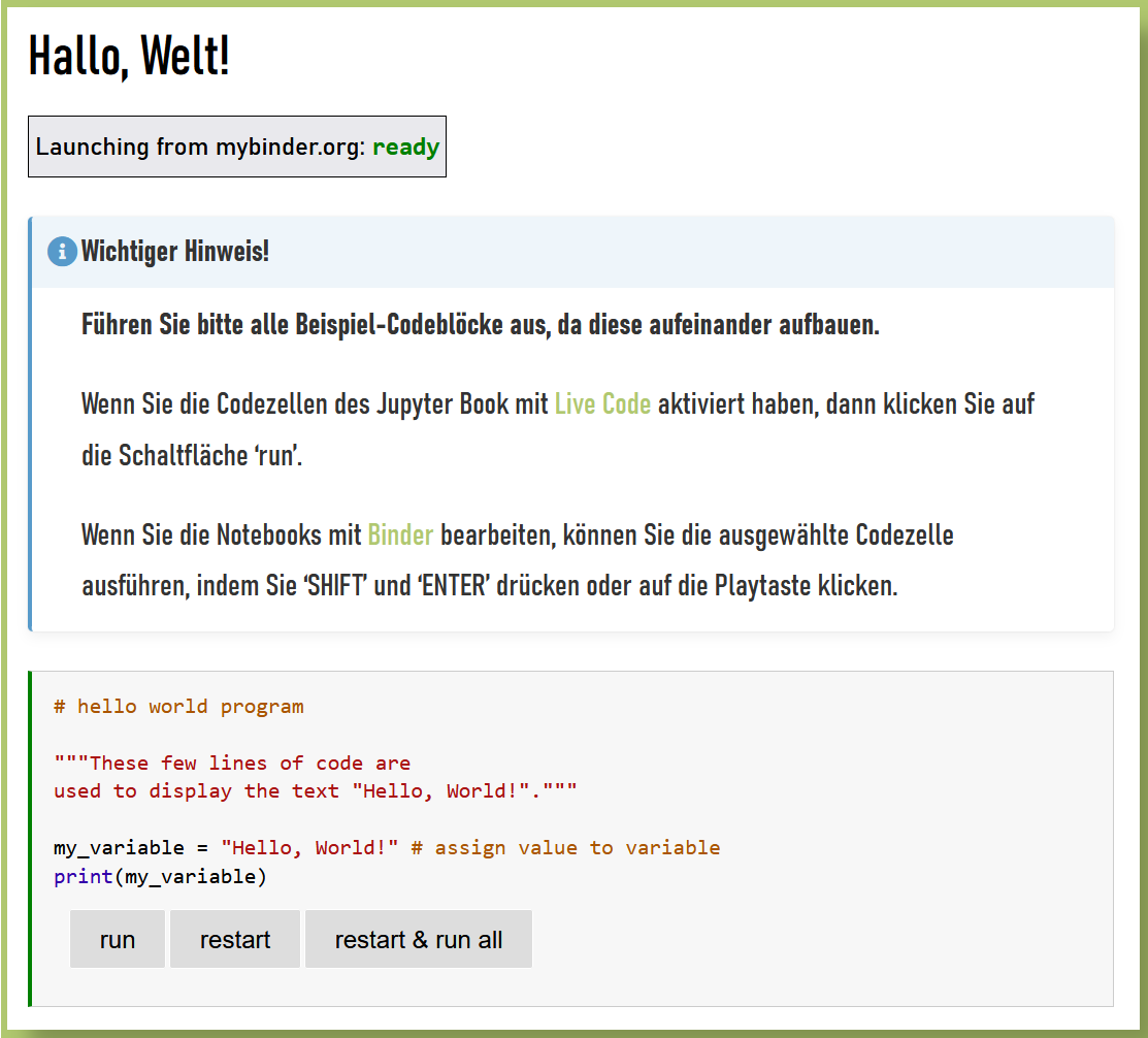 Wenn Sie lieber in der Umgebung des Jupyter Books bleiben möchten, bietet sich die Nutzung von “Live Code” an. Im Hintergrund lädt das an Binder anschließende Projekt Thebe das aktuell vorliegende Kapitel und sorgt dafür, dass die Codeinhalte direkt ausführbar und bearbeitbar sind. Dazu werden zu den entsprechenden Zellen verschiedene Button ergänzt. Den Code in den Zellen können Sie nach Belieben verändern und den Output inspizieren. Der Vorteil ist, dass Sie nicht auf eine externe Seite weitergeleitet werden. Sie können allerdings keine neuen Code- oder Textblöcke in das Notebook einfügen, sondern eben nur bestehende Codeabschnitte bearbeiten. Probieren Sie gerne beide Varianten aus und entscheiden Sie für sich, womit Sie am komfortabelsten arbeiten können. Für welche der Varianten Sie sich auch entscheiden: Sie benötigen zur Bearbeitung des Jupyter Books lediglich einen Browser sowie eine stehende Internetverbindung.